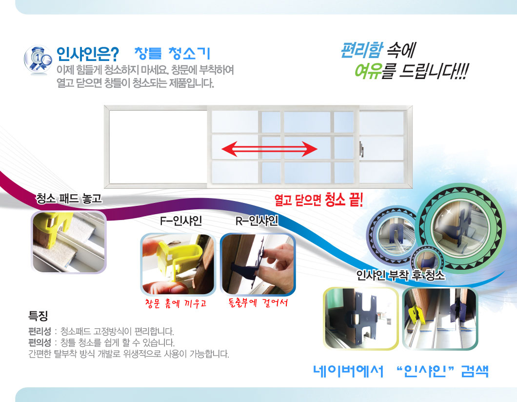 창틀은 홈이 좁고 깊어 청소하기 힘드시죠? 창문에 부착하여 열고 닫으면 창틀이 깨끗해지는 창틀 청소기 "인샤인"이 개발되었습니다. 한번 깨끗하게 청소하여 부착하여 놓으면 열고 닫으면 청소가 되니 일부러 청소하지 않아도 된답니다. 자세히 보기 : https://blog.naver.com/sea7lark 사러 가기 : https://smartstore.naver.com/joyfultools/products/2491852679